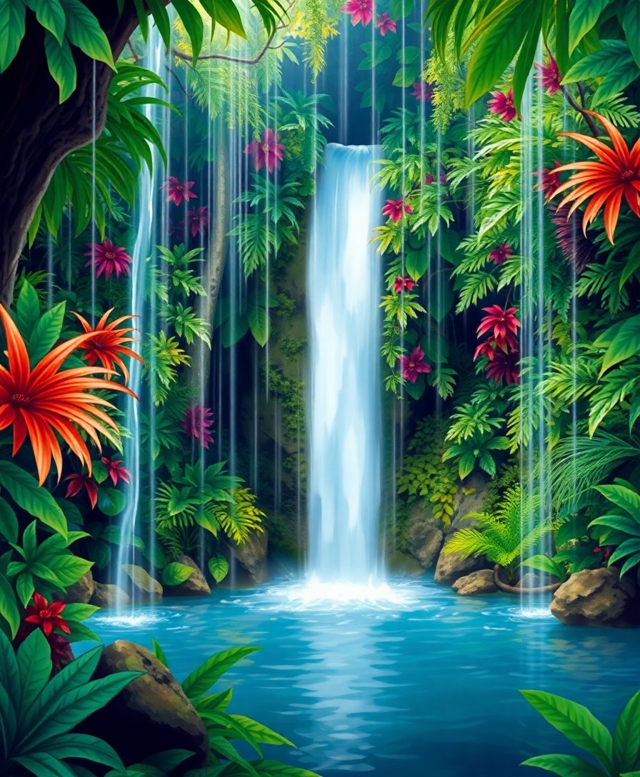 Ultimately, add final details to the waterfall and rain effects using your smallest brush. Consequently, step back and admire your completed tropical sanctuary. The finished piece radiates the peaceful energy of a hidden grotto.