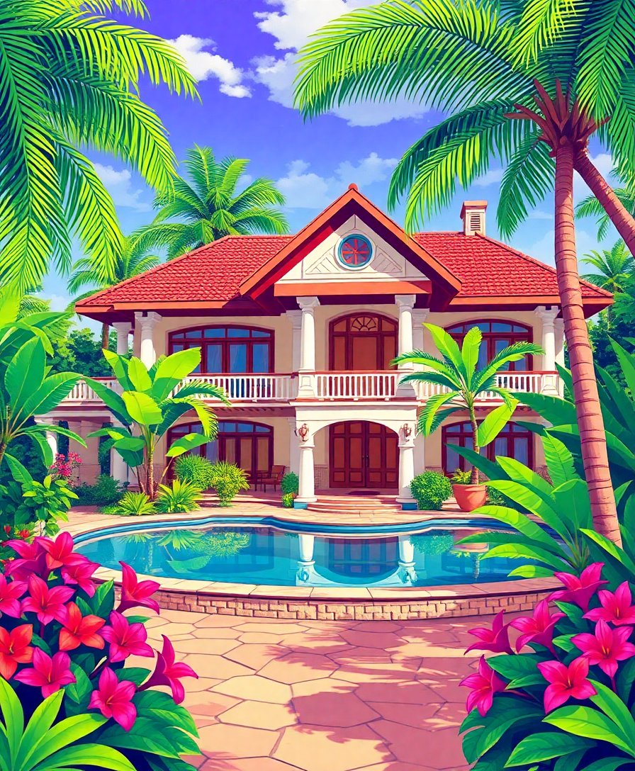 Embrace the tranquil beauty of tropical architecture through this engaging artistic adventure. Moreover, each painting session transports you to a serene manor surrounded by flourishing greenery, making it perfect for relaxation or gifting to nature enthusiasts.