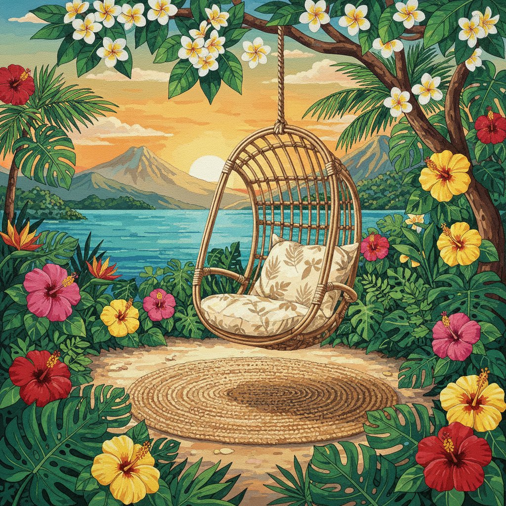 Transform your space into a tranquil paradise with our Lush Tropical Rattan Rest Paint By Numbers. This stunning design captures the essence of a peaceful tropical retreat, featuring intricate rattan furniture nestled among vibrant, overgrown foliage. Meanwhile, the realistic botanical details invite you to escape into a world of serene beauty.