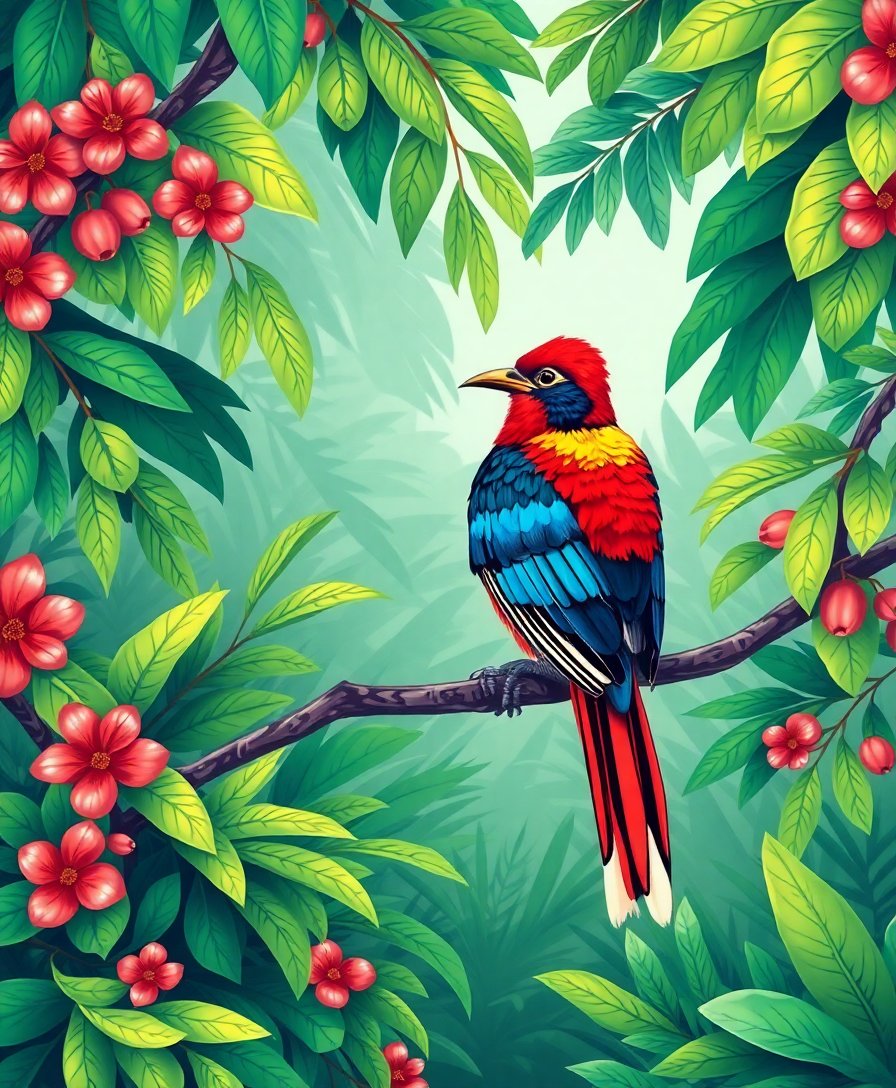 Ultimately, refine tiny details around feathers, branches, and distant foliage. Soften any sharp edges with a lightly damp brush. After the acrylic paint dries, step back and enjoy your new creative masterpiece glowing with tropical color and life.