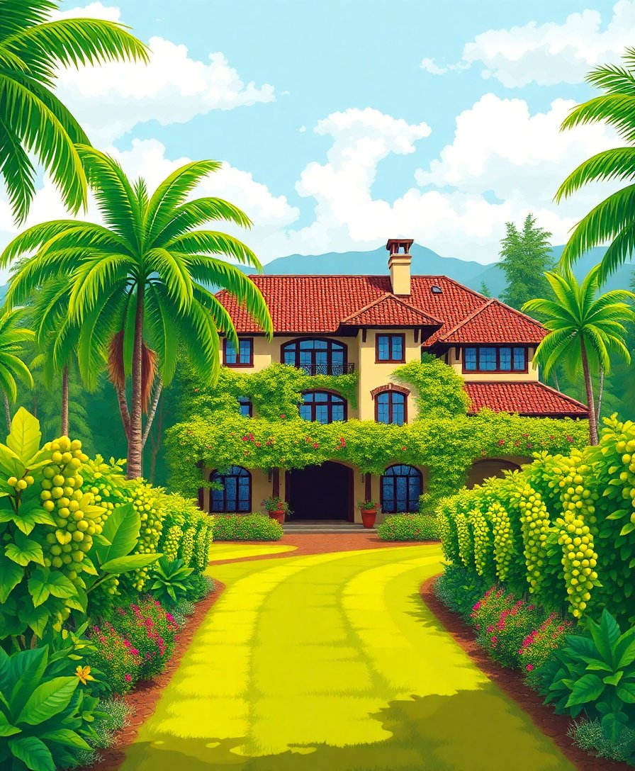 Ultimately, add the finest details with your small brush to complete the tropical estate scene. Step back and admire your realistic vineyard manor surrounded by lush vegetation. Your artistic achievement deserves prominent display.