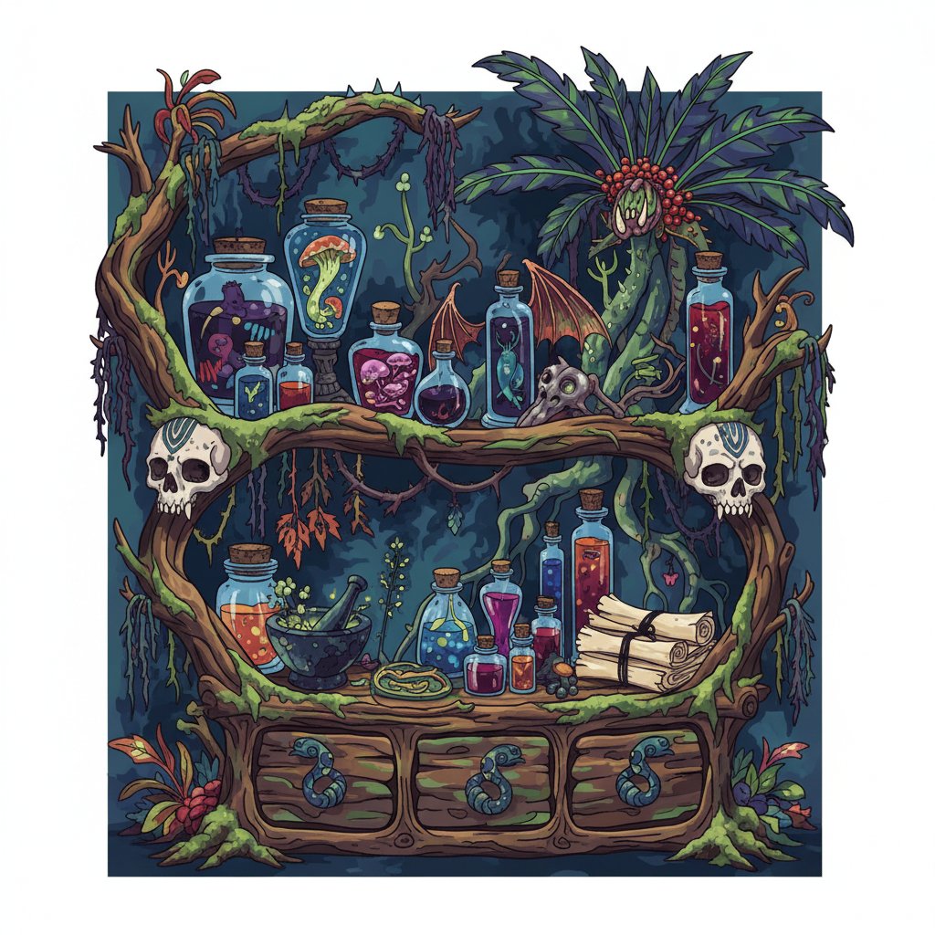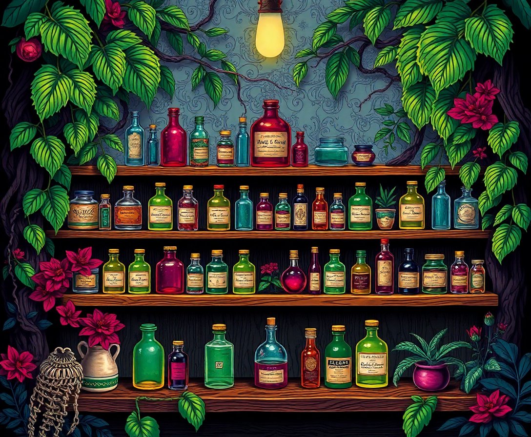 Ultimately, complete the finest details like glass reflections and herb textures. Your finished piece showcases an atmospheric apothecary perfect for Halloween display.