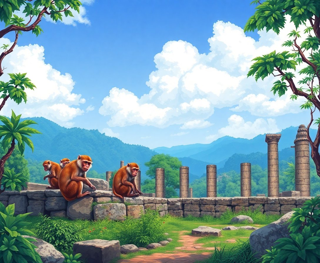 The sepia tones and architectural decay create a sophisticated vintage aesthetic. The playful monkeys add whimsical charm to the historical ruins theme.