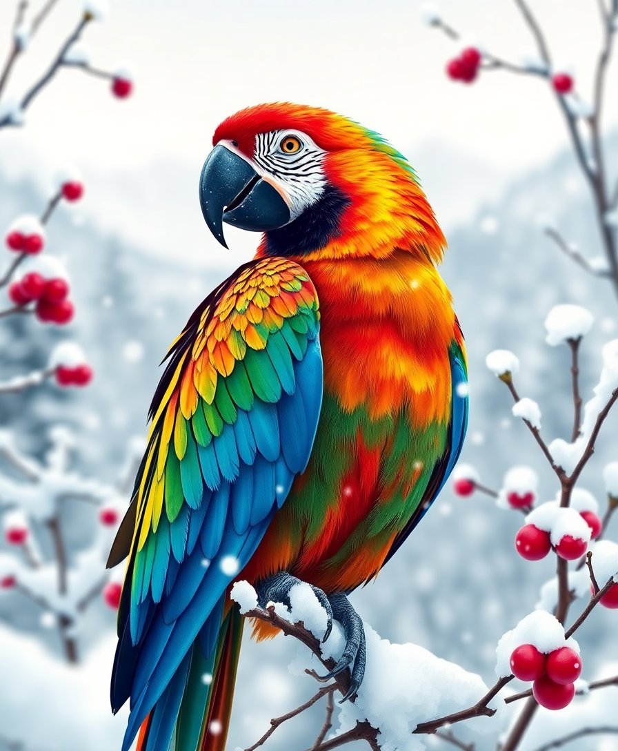 The unique combination of tropical macaw colors against winter snow creates stunning visual contrast. This vintage-inspired artwork brings warmth and character to any room.