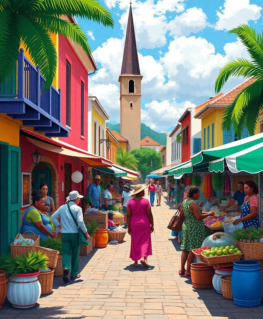 This historically accurate depiction showcases authentic Bridgetown architecture and tropical market atmosphere. The realistic details and sunlit color palette create an immersive Caribbean experience.
