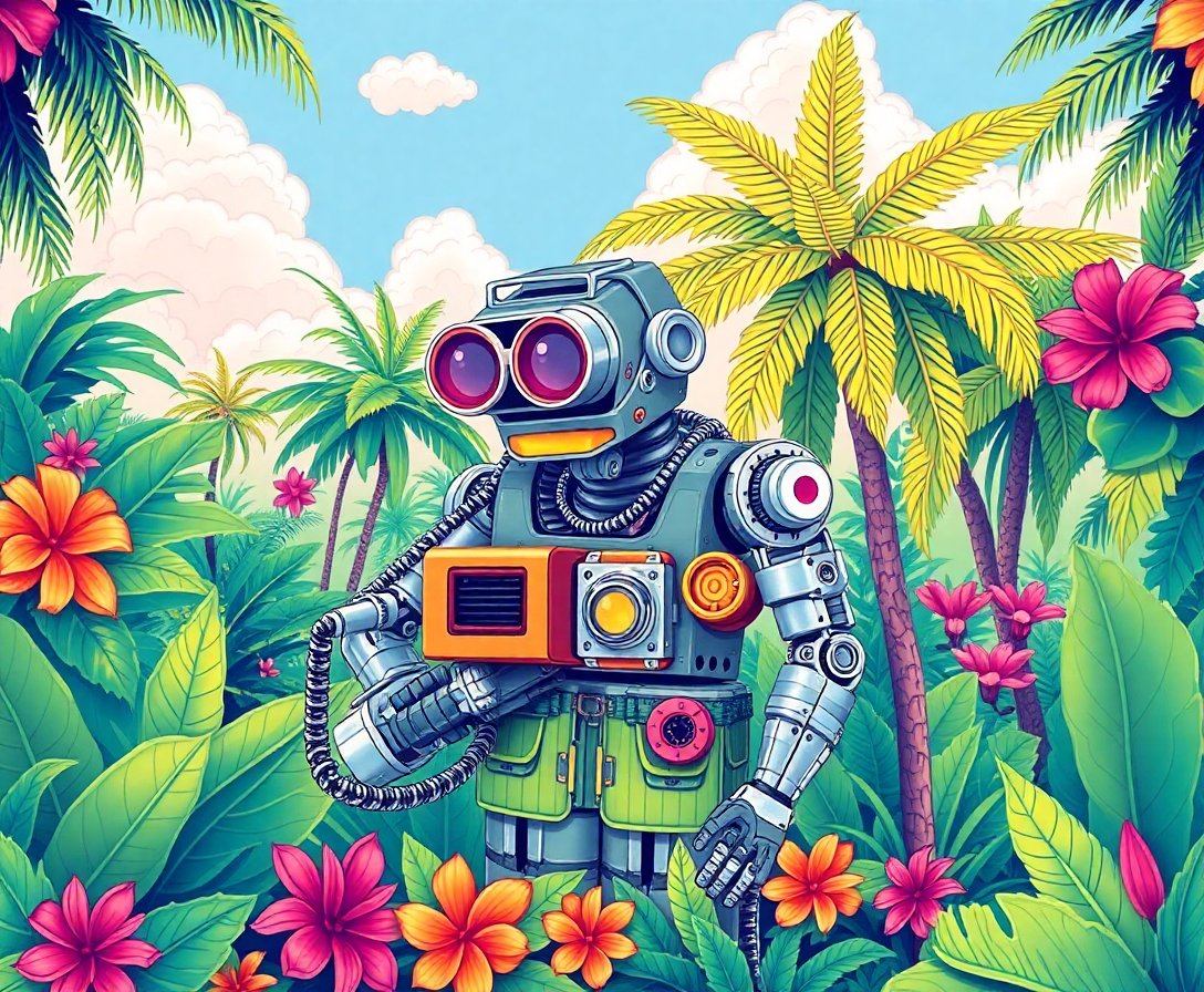 Transform your space with the captivating Mechanical Caretaker Tropical Oasis Paint By Numbers, where vintage robotics meets lush paradise. This extraordinary design blends nostalgic charm with tropical wonder. Furthermore, it creates an unforgettable artistic journey that celebrates both nature and technology.