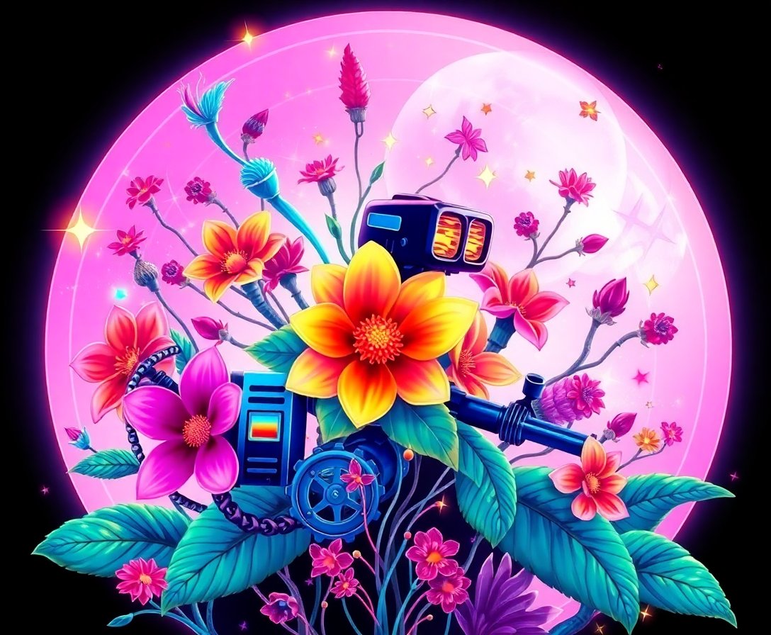 The unique combination of vintage sci-fi elements with luminous tropical flora creates an eye-catching contrast. The mysterious mechanical explorer theme offers both nostalgia and modern appeal.