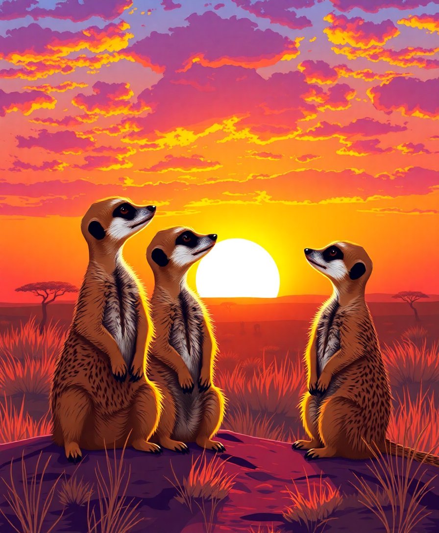 Transform your artistic journey with our stunning Meerkats Watching The Sunrise Paint By Numbers masterpiece. This captivating design features noble sentinels standing guard as golden sunlight bathes the African plains. Moreover, each numbered section guides you through creating this breathtaking savannah scene.