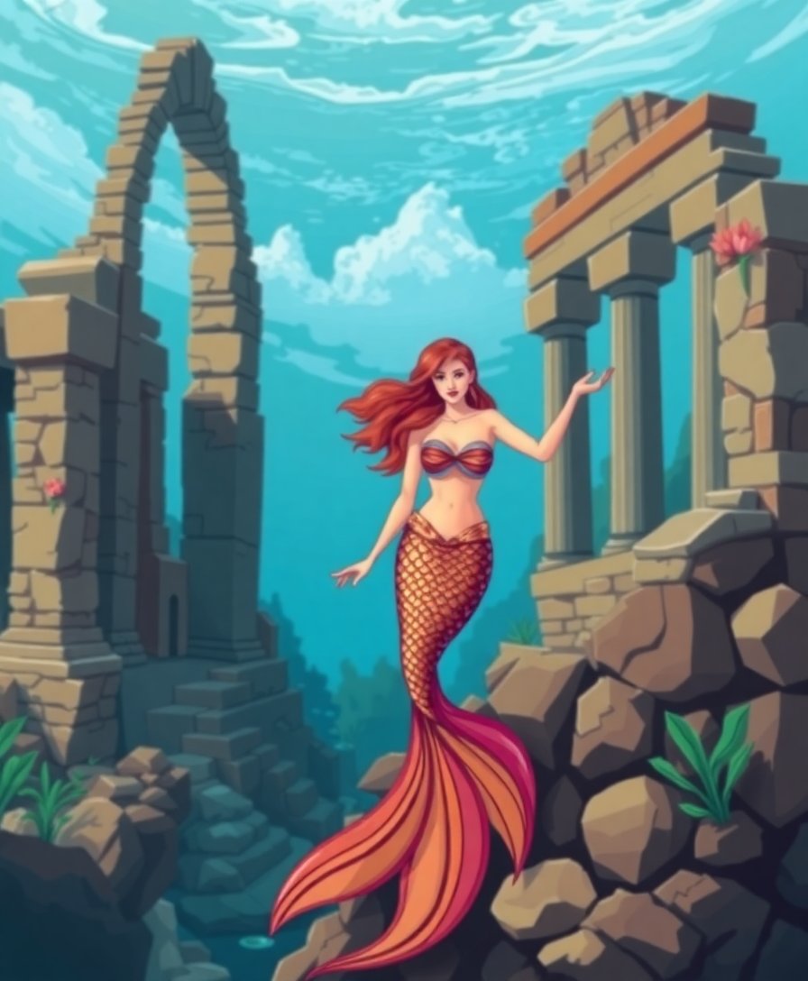 Ultimately, step back and admire your completed underwater mythology scene. Furthermore, the weathered ruins and tropical mermaid will create stunning wall art. Consequently, your artistic achievement brings ancient Atlantis legends to life.