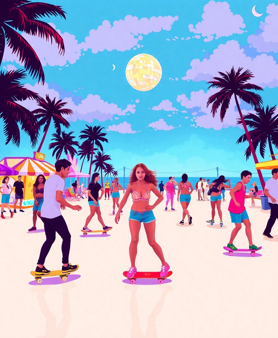 Ultimately, step back and admire your completed vintage roller disco masterpiece. The tropical pastels and realistic details now bring Miami’s iconic beachfront skating culture to life. Your finished artwork becomes a stunning conversation piece that celebrates both artistic achievement and nostalgic pop culture memories.