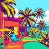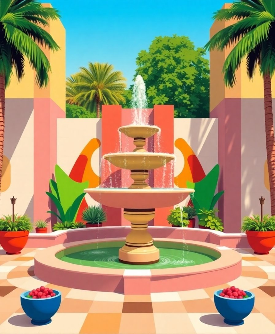 Our realistic reproduction captures authentic midcentury aesthetics with precision. The concrete fountain details challenge intermediate painters beautifully. Moreover, the tropical elements add vibrant contrast to geometric structures perfectly.