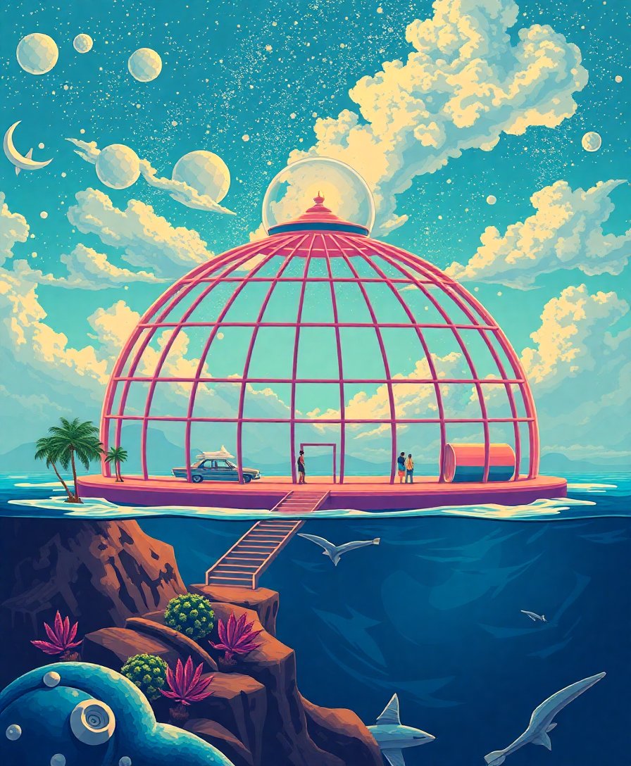 Ultimately, step back and admire your completed utopian underwater scene. Moreover, the atomic-age dome structure surrounded by vibrant marine life creates a stunning focal point. Therefore, your finished artwork embodies the perfect blend of vintage sci-fi and tropical paradise themes.