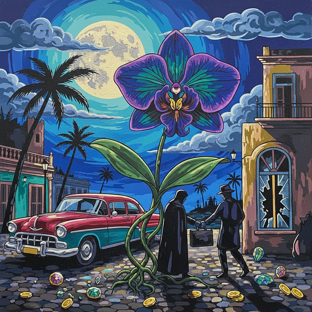 The unique blend of tropical orchids with noir mystery creates a sophisticated artwork perfect for entertainment rooms or study spaces.