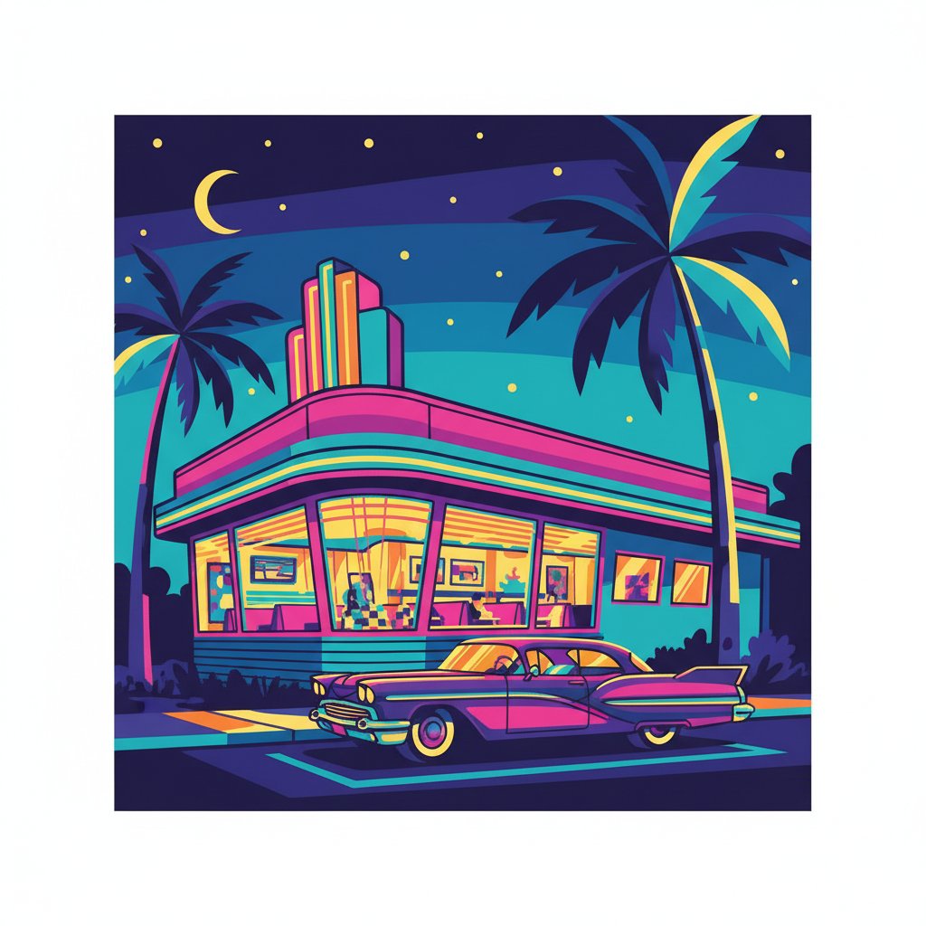 Transform your living space with this charming representation of midnight dining culture. Every brushstroke brings you closer to owning a personalized piece of retro Americana that celebrates the timeless appeal of palm-lined diners.