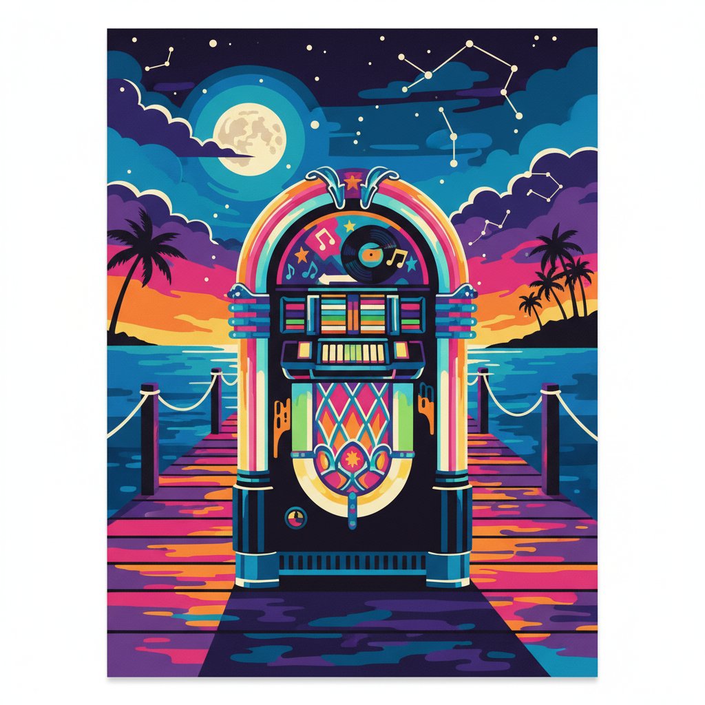 Transform your space with this stunning Midnight Pier Retro Jukebox Paint By Numbers masterpiece. This captivating design combines vintage charm with neon nostalgia, featuring a classic jukebox illuminated against a moonlit pier setting. Perfect for music lovers and vintage enthusiasts alike.