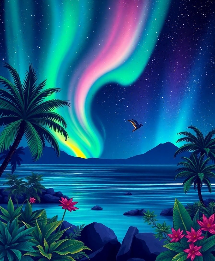 Transform your space with the enchanting Midnight Tropical Borealis Paint By Numbers, where tropical paradise meets celestial wonder. This stunning artwork captures the magical moment when aurora borealis dances above palm-fringed shores. Subsequently, you’ll experience the perfect blend of tropical warmth and cosmic beauty.