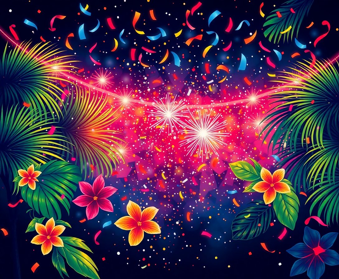 Ultimately, step back and admire your completed tropical celebration scene. The vibrant confetti and midnight atmosphere create stunning visual impact. Display your finished artwork with pride.