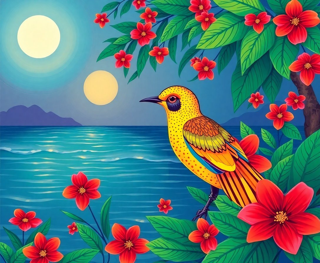 Ultimately, step back and admire your completed masterpiece. The finished painting captures the magical essence of tropical festivities. Your artwork is ready for display and admiration.