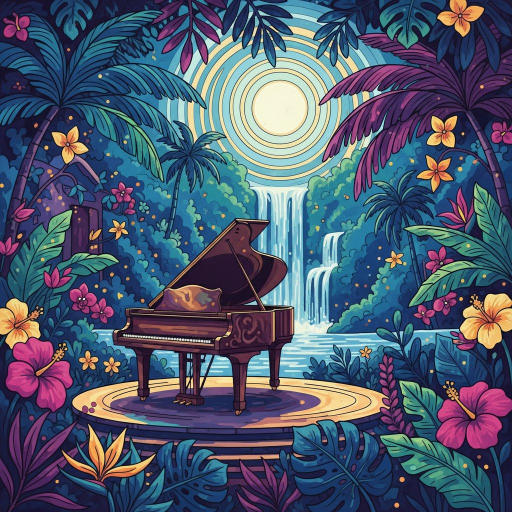 Ultimately, step back and admire your finished tropical concert scene. The midnight blue background creates dramatic contrast against the illuminated grand piano. Your completed masterpiece captures the romantic essence of moonlight concerts beautifully.