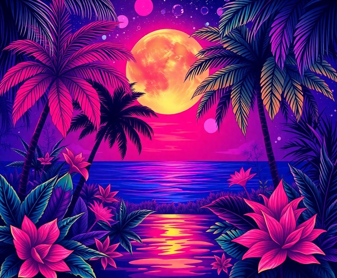 The tropical glow effects and nighttime atmosphere create stunning visual depth. The chiaroscuro lighting technique adds professional artistic dimension to your finished piece.