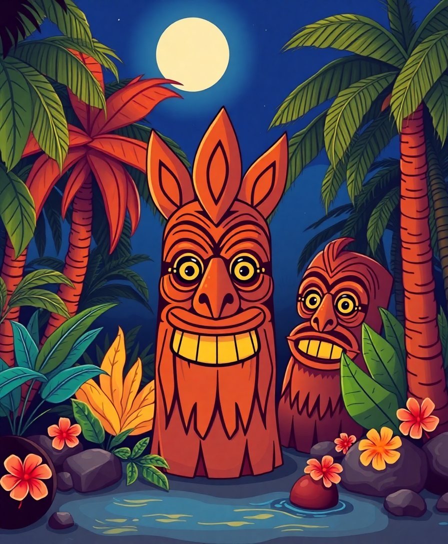 Ultimately, step back and admire your finished masterpiece. The luminescent qualities create stunning nighttime ambiance. Your completed artwork showcases exotic tiki culture with professional artistic flair.
