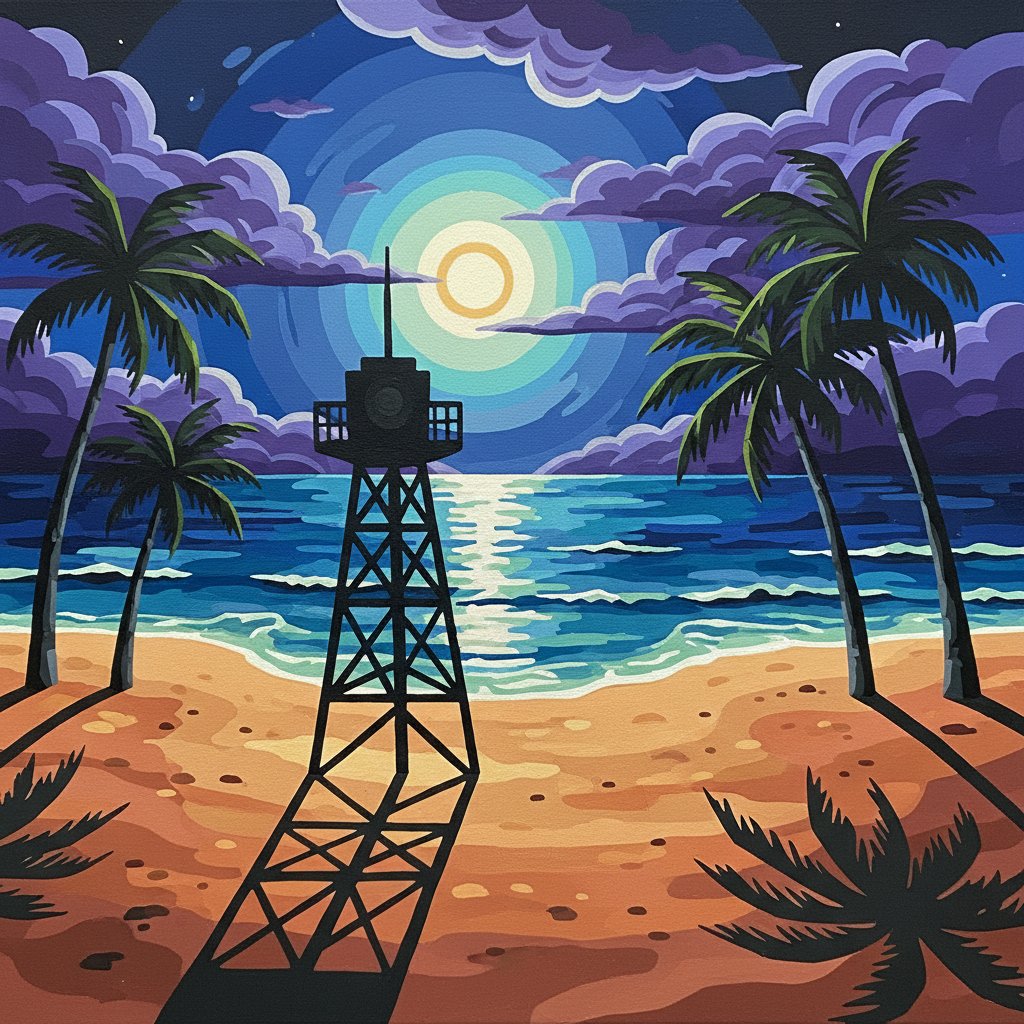 Perfect for vintage radio enthusiasts, broadcasting fans, or anyone who appreciates noir-inspired tropical art. The sophisticated design appeals to diverse artistic tastes.