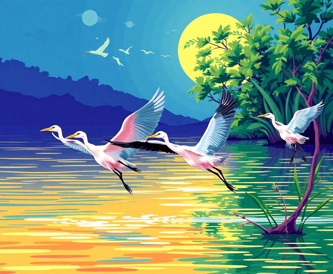 Transform your creative space with the stunning Migrating Herons Amazon Delta Paint By Numbers masterpiece. This captivating wetland scene brings the serene beauty of migratory herons to life. Moreover, you’ll discover the therapeutic joy of painting while creating breathtaking riverbank art.