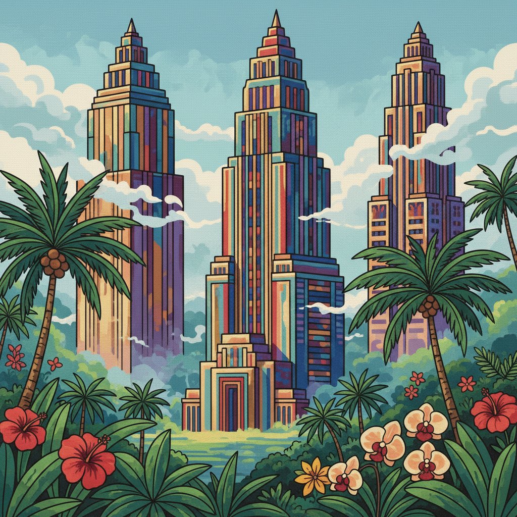 Ultimately, step back and admire your finished tropical towers emerging from ethereal mist. Furthermore, the architectural cityscape now radiates sophisticated Art Deco charm. Indeed, your completed artwork deserves prominent display.