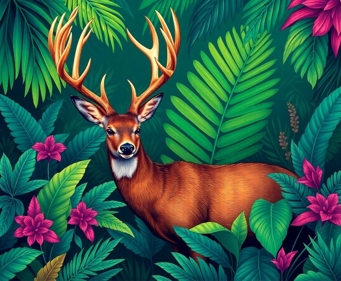 The high-quality linen canvas measures perfectly for home display, providing ample space to capture every tropical detail and the majestic buck’s enchanting presence.