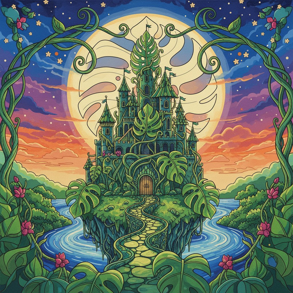 Ultimately, step back and admire your completed romantic castle surrounded by verdant monstera leaves. Finally, the finished piece showcases both architectural beauty and botanical elegance perfectly combined.