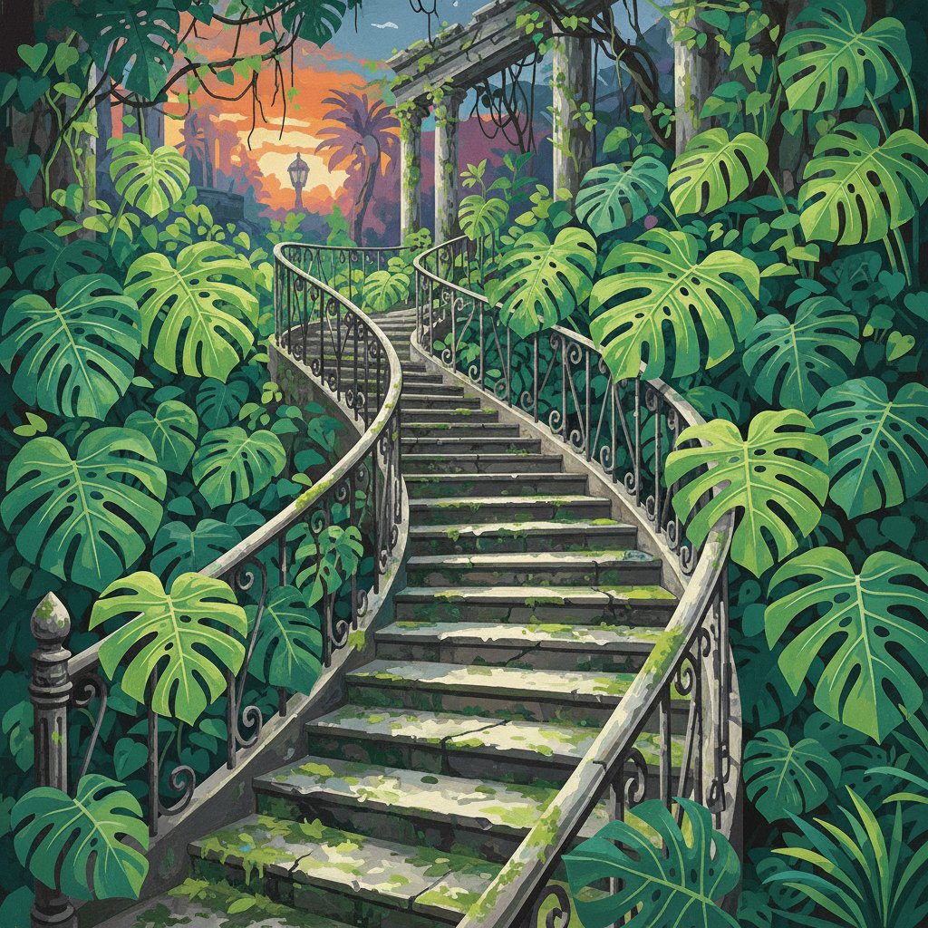 Therapeutic Benefits of This Monstera Engulfing Vintage Stairs Paint By Numbers Experience
