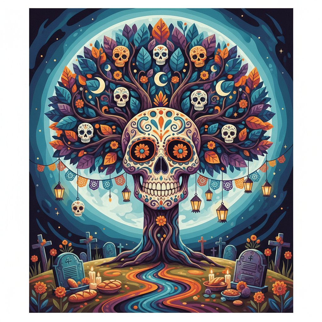 This artwork authentically celebrates Mexican cultural heritage through detailed calavera imagery beneath a mystical moonlit canopy. It’s perfect for honoring traditions while creating meaningful art.