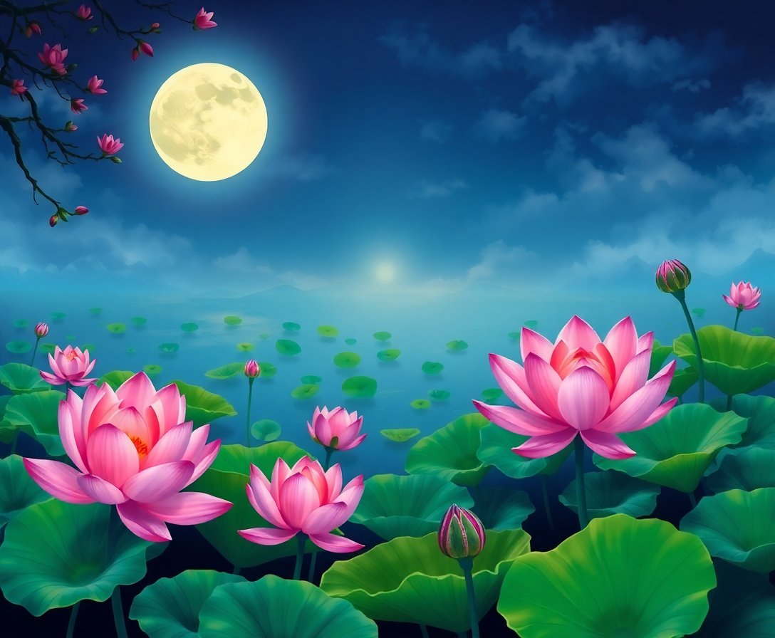 Ultimately, step back and admire your completed nocturnal pond scene. The moonlit lotus blossoms now grace your wall magnificently. Additionally, proper framing enhances the vintage aesthetic beautifully.