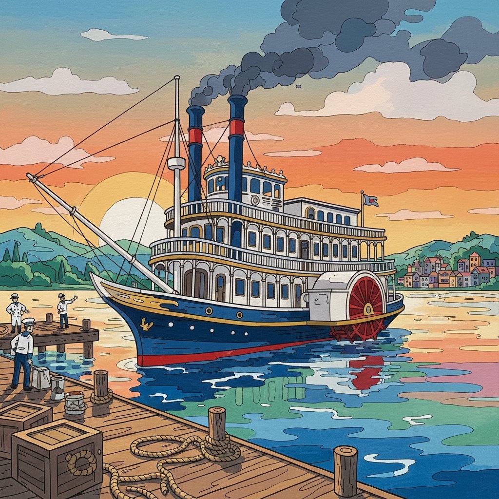 Yes! The carefully selected color palette captures authentic vintage steamboat aesthetics with realistic harbor reflections and nostalgic sepia tones.