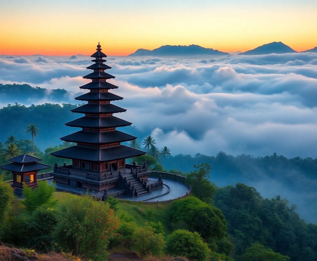 Ultimately, add the final details to complete your tropical landscape masterpiece. Step back and admire how the morning mist creates depth and atmosphere around Mount Agung. Your finished painting radiates the peaceful energy of this sacred Indonesian landmark.