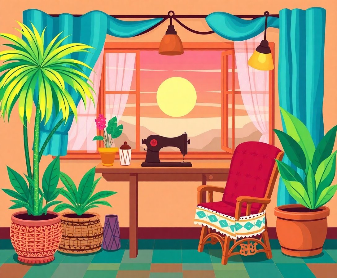 This artwork captures authentic vintage charm with realistic palm fronds, cozy fabric textures, and warm morning light. The detailed design celebrates traditional craftsmanship in a peaceful setting.