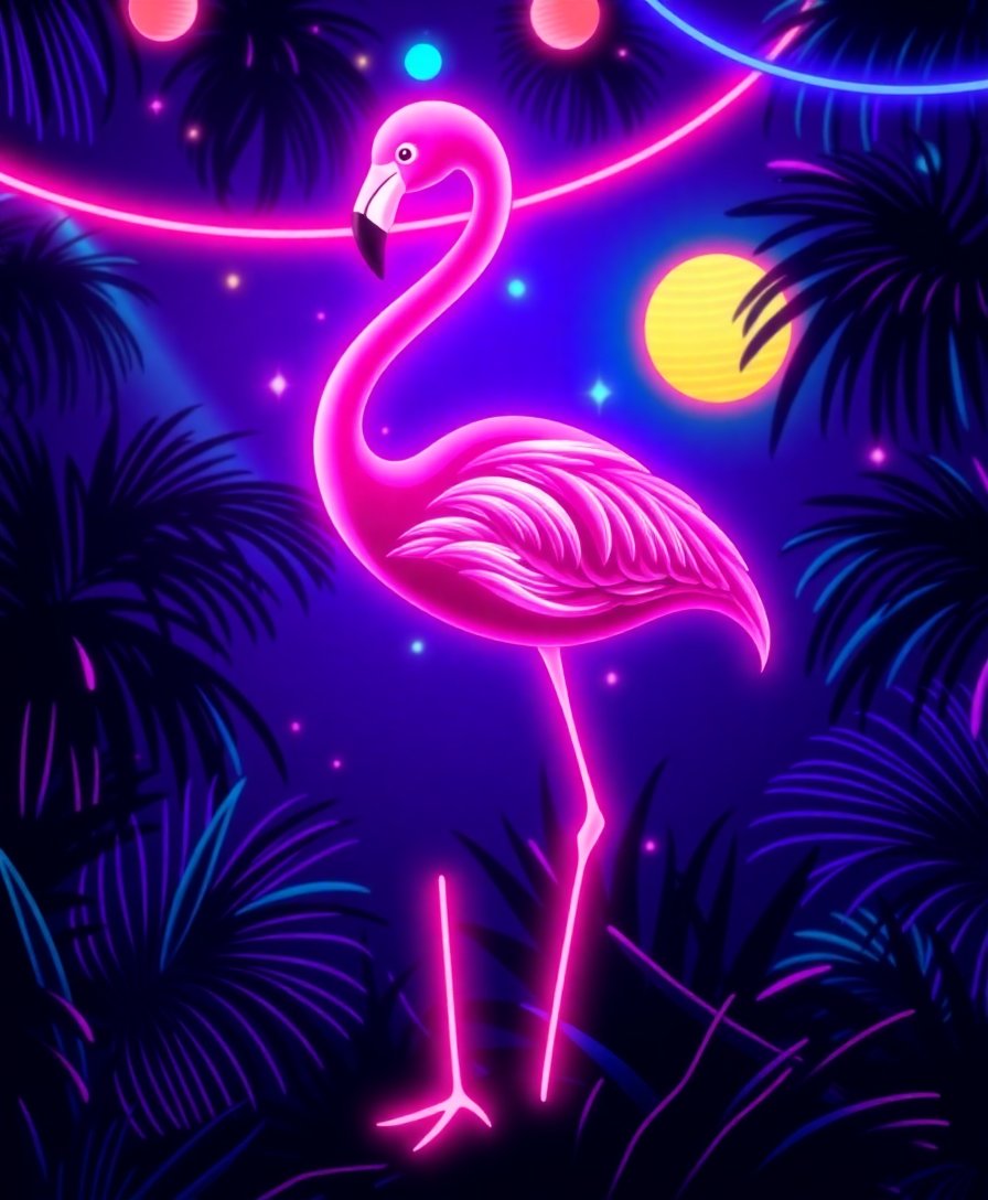 Transform your space with vibrant retro charm through this stunning Neon Flamingo Night Glow Paint By Numbers masterpiece. This captivating design combines tropical elegance with neon pink brilliance, creating an eye-catching piece that celebrates both realistic artistry and pop culture nostalgia.