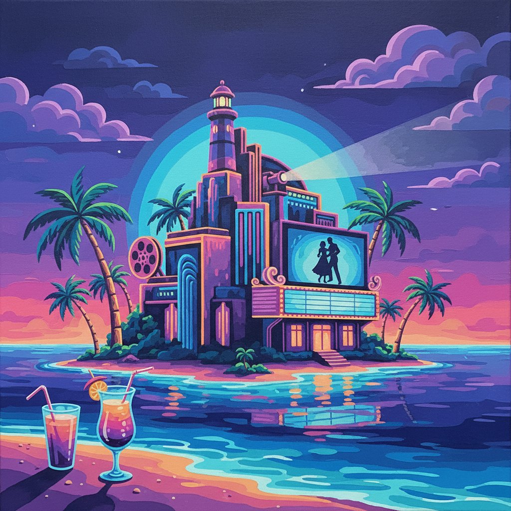 Transform your space with this captivating Neon Island Theater Drinks Paint By Numbers masterpiece. This tropical vintage design combines the glamour of classic cinema with illuminated neon aesthetics. Moreover, it brings nostalgic drive-in movie theater vibes directly to your walls.