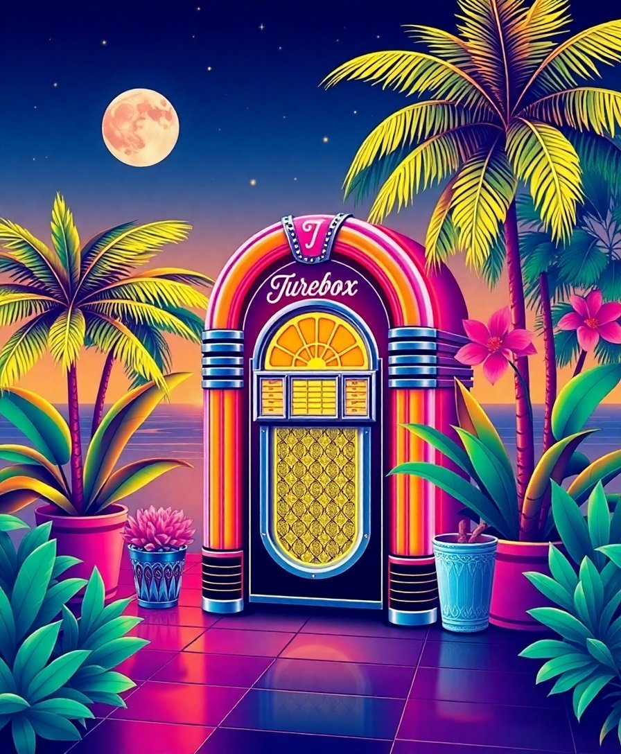 This design combines iconic jukebox aesthetics with tropical paradise elements. Moreover, the high-quality materials ensure lasting vibrancy and professional results. Additionally, the nostalgic theme appeals to both vintage enthusiasts and art lovers alike.
