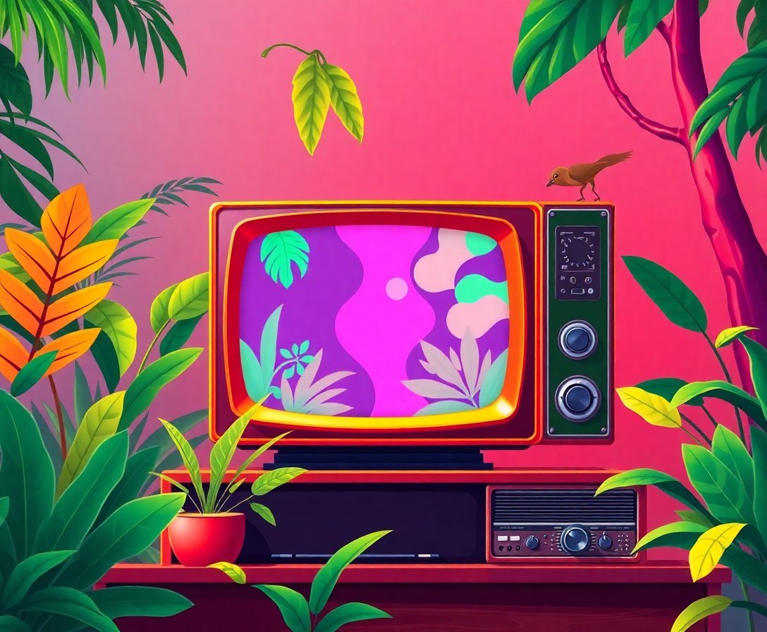 Transform your space with this captivating Neon Jungle Television Set Paint By Numbers kit. This stunning artwork combines retro television nostalgia with vibrant tropical elements. Create your own moody masterpiece featuring realistic monstera leaves surrounding a vintage TV set.