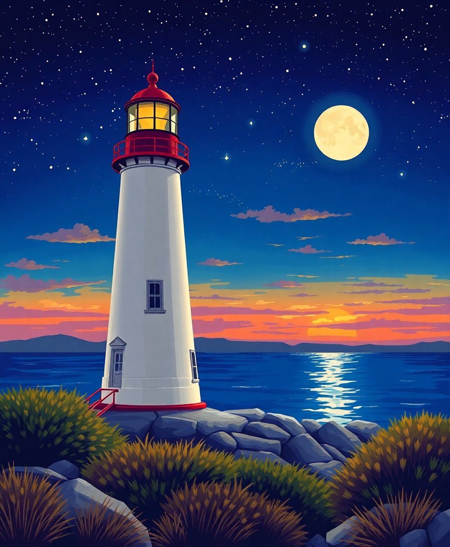 Ultimately, complete the twilight sky gradations and coastal reflections. Your finished piece radiates the peaceful essence of island living. Mount your masterpiece proudly to showcase this mesmerizing beacon scene.