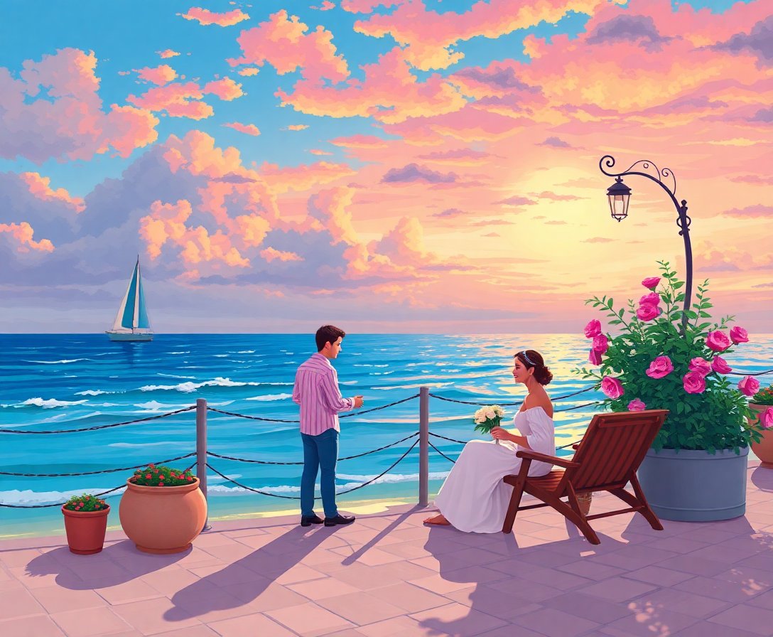 Ultimately, step back and admire your finished vintage masterpiece. The romantic silhouettes against the tropical ocean backdrop create a truly mesmerizing display. Your completed artwork captures the nostalgic charm of cult cinema perfectly.