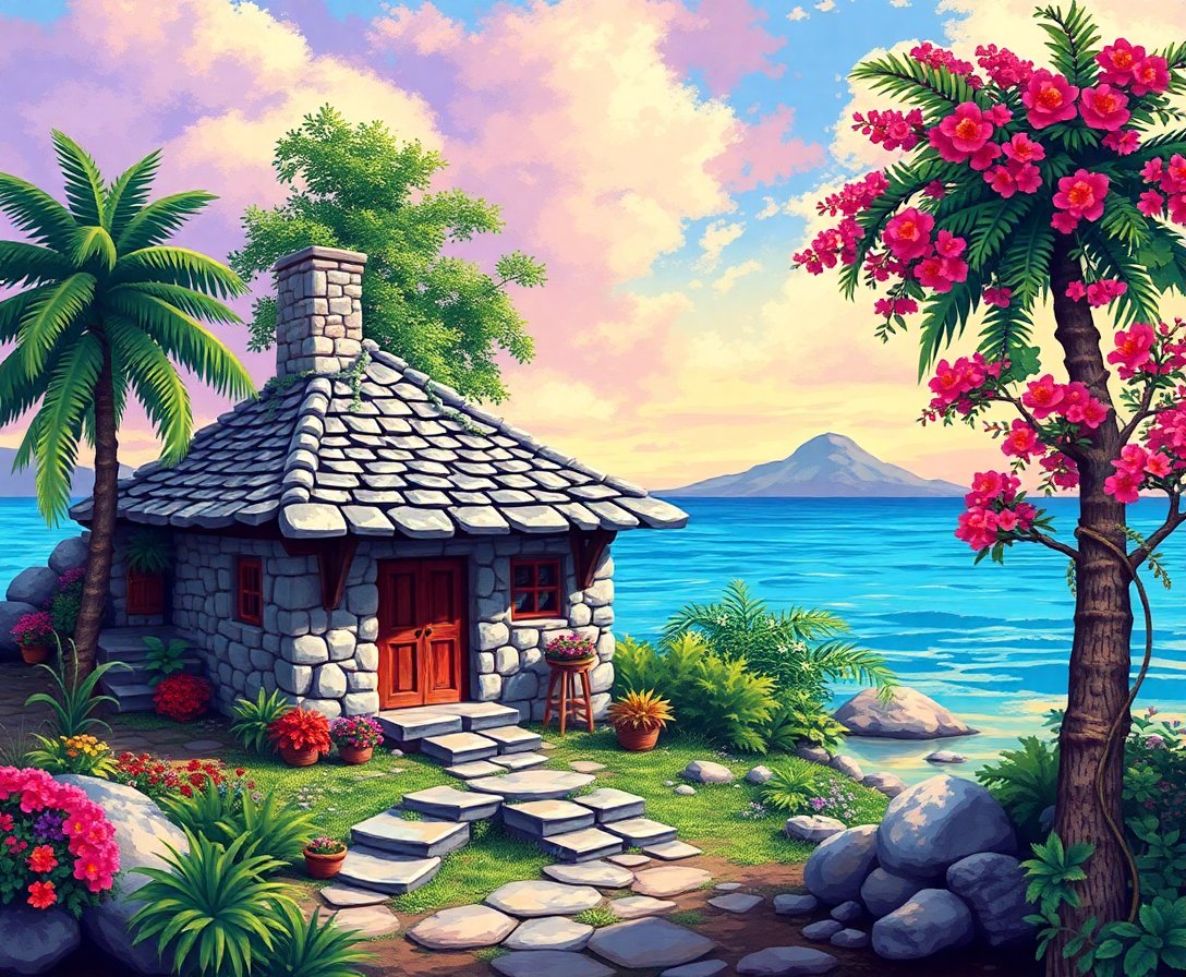 Transform your space with this captivating Nostalgic Island Hideaway Paint By Numbers kit. This vintage-inspired artwork captures a secluded stone cabin nestled within lush tropical paradise. Experience the joy of creating your own masterpiece while discovering the therapeutic benefits of guided painting.
