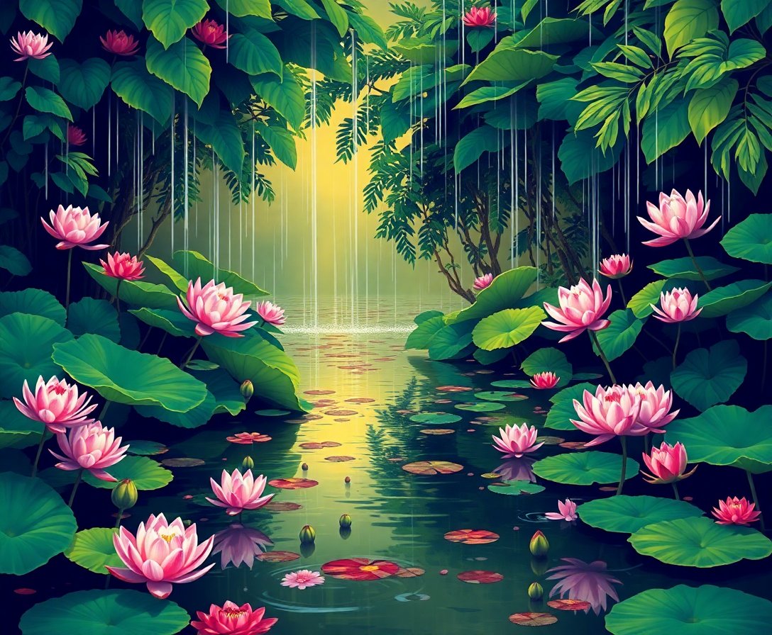 Transform your creative space with the captivating Nostalgic Tropical Pond Downpour Paint By Numbers. This enchanting kit brings together vintage charm and tropical beauty. The moody storm atmosphere creates an immersive artistic journey. Meanwhile, delicate blossoms add elegance to this stunning landscape masterpiece.