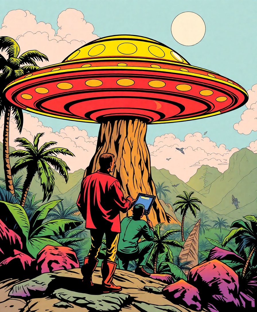Ultimately, step back and admire your completed masterpiece. The warm beachfront setting perfectly frames the enigmatic flying saucer scene. Your finished artwork captures both tropical serenity and golden age mystery.