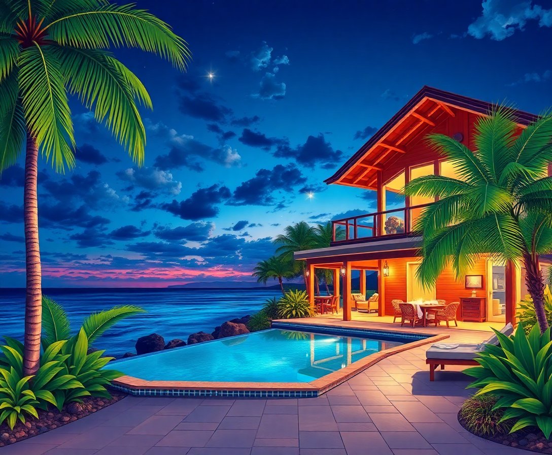 Ultimately, step back and admire your finished tropical nightscape masterpiece. The villa’s architectural details against the moonlit sky create a stunning focal point. Your completed artwork radiates peaceful coastal charm.