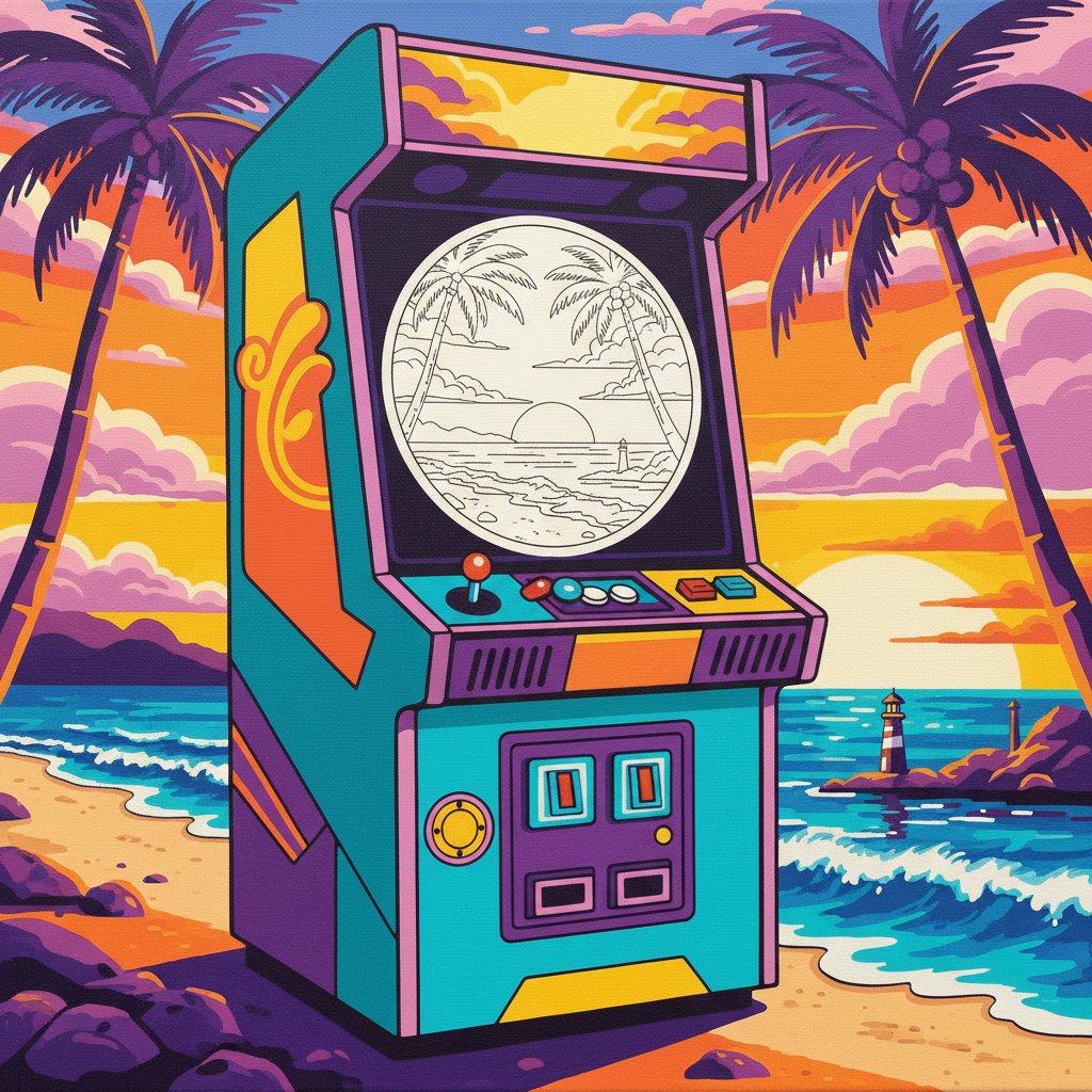 Ultimately, step back to admire your completed masterpiece. The sunlit oceanfront backdrop perfectly complements the realistic arcade cabinet. Display your finished artwork proudly in any gaming or entertainment space.
