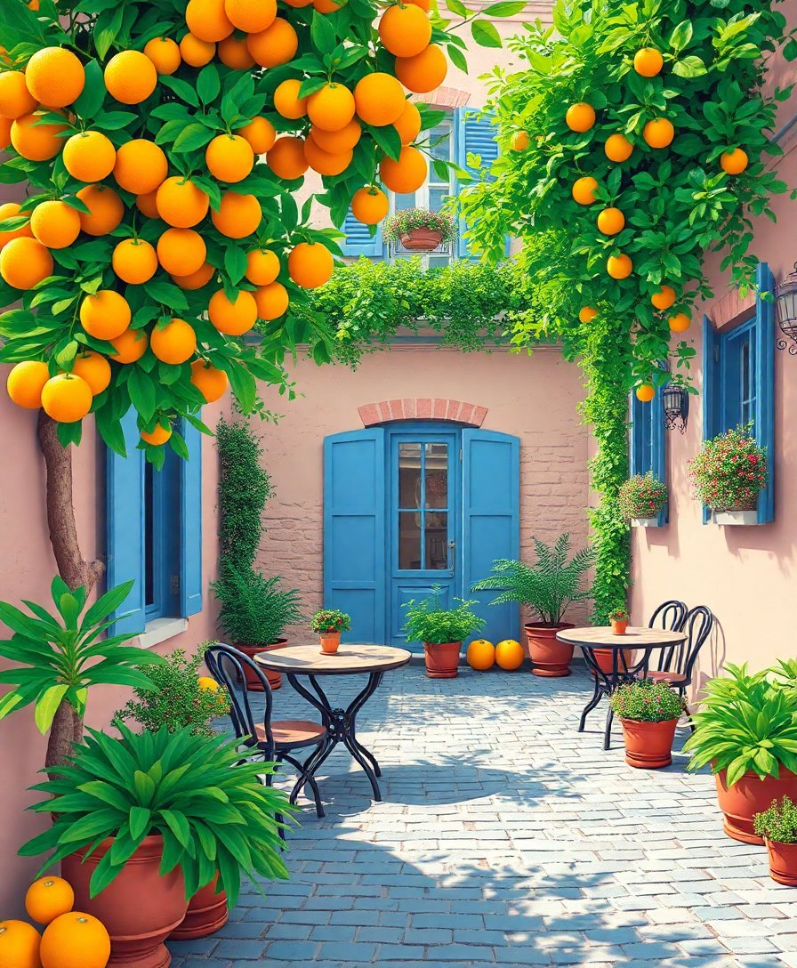 The canvas measures 16×20 inches, providing ample space to showcase the intricate patio details and citrus tree elements beautifully.