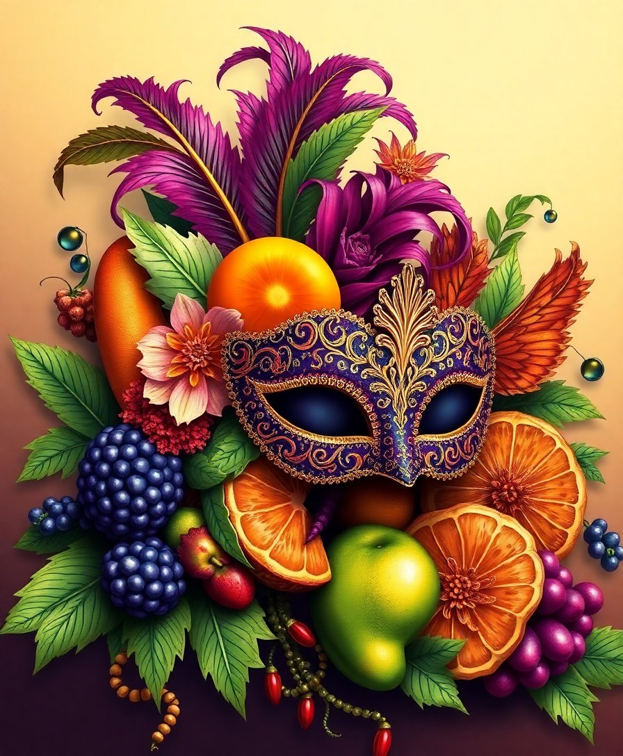 Transform your space with this stunning Opulent Masquerade Fruit Decor Paint By Numbers masterpiece. This captivating design blends festive elegance with tropical sophistication. Create a vibrant artwork that celebrates the mystique of masquerade traditions.