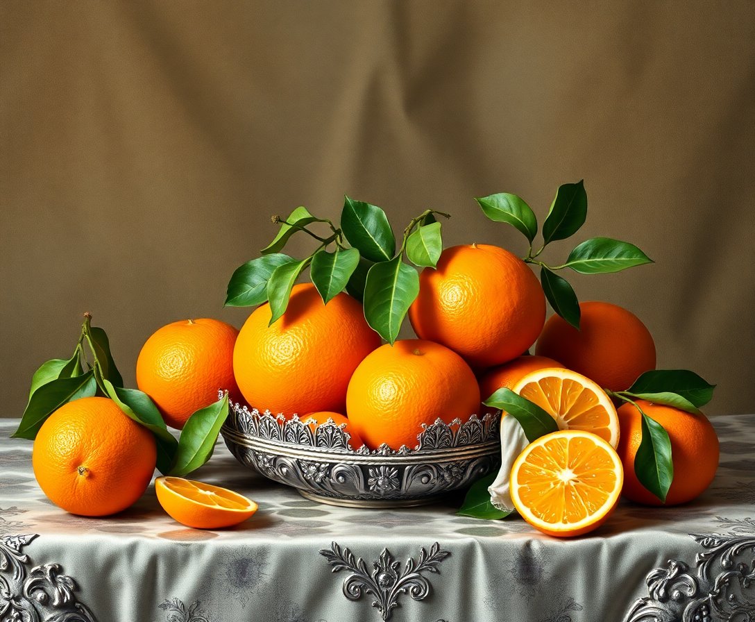 Transform your creative space with this exquisite Oranges On Baroque Silver Paint By Numbers masterpiece. This sophisticated vintage-inspired design captures the timeless elegance of baroque still life artistry. Moreover, the rich metallic accents and warm citrus tones create a stunning focal point for any room.